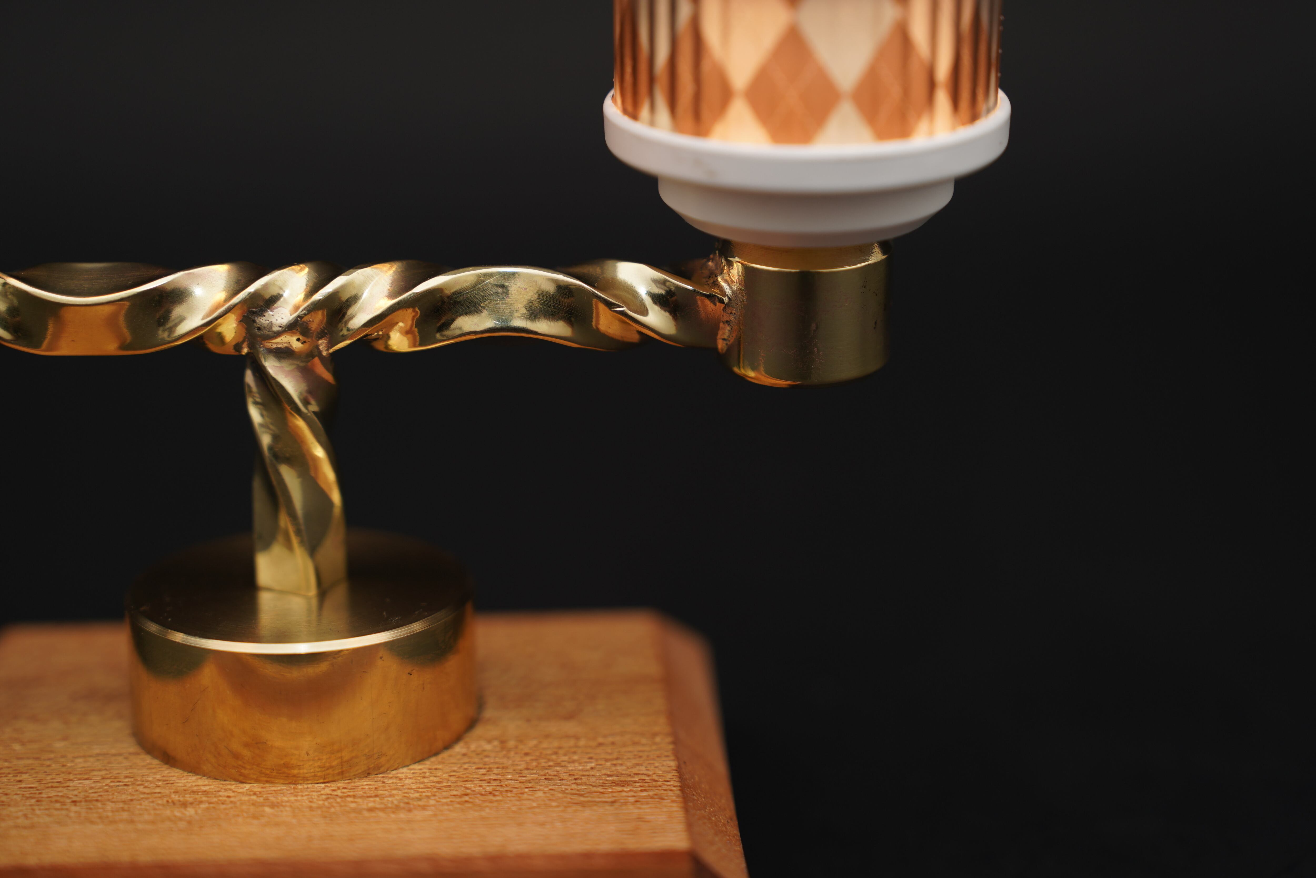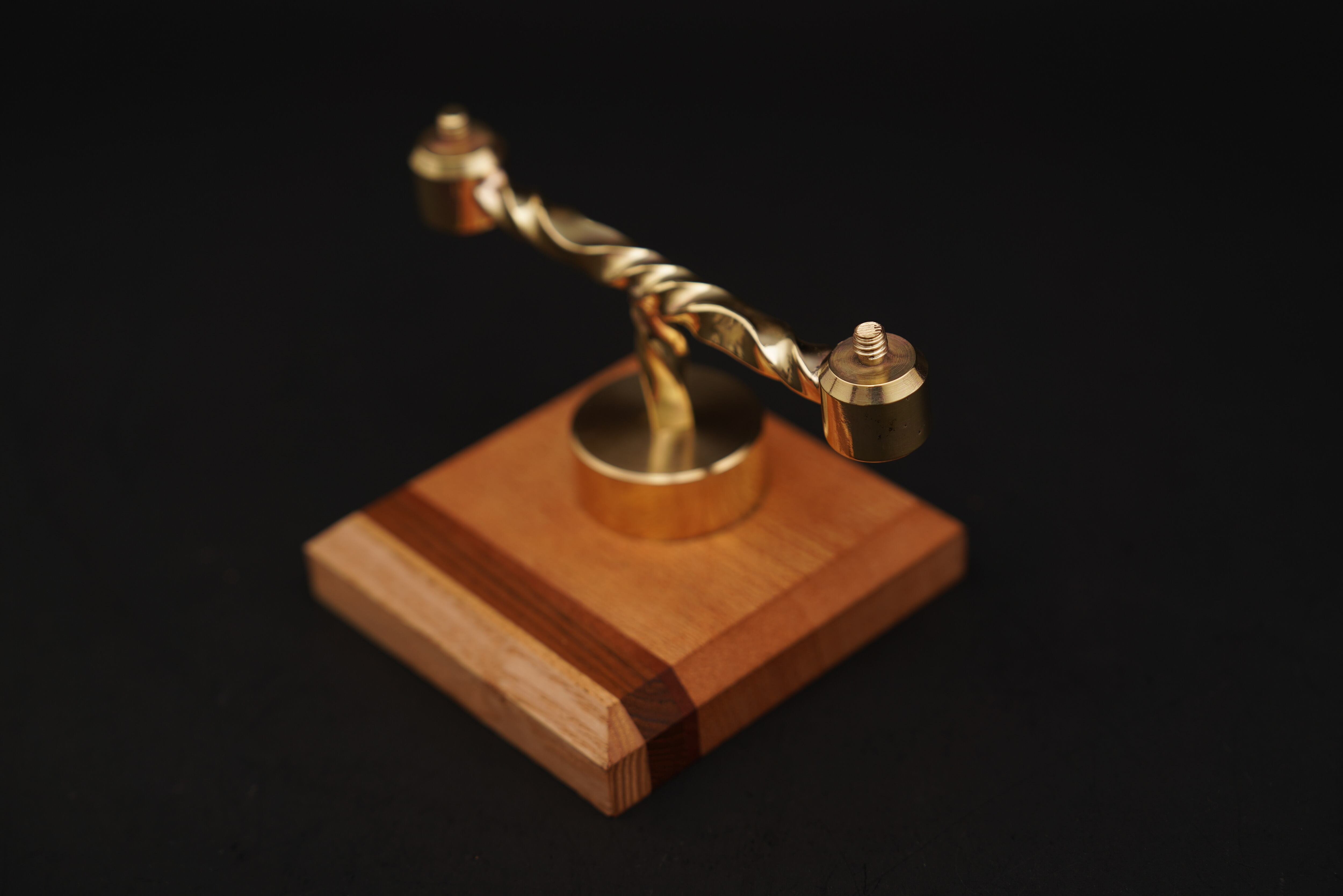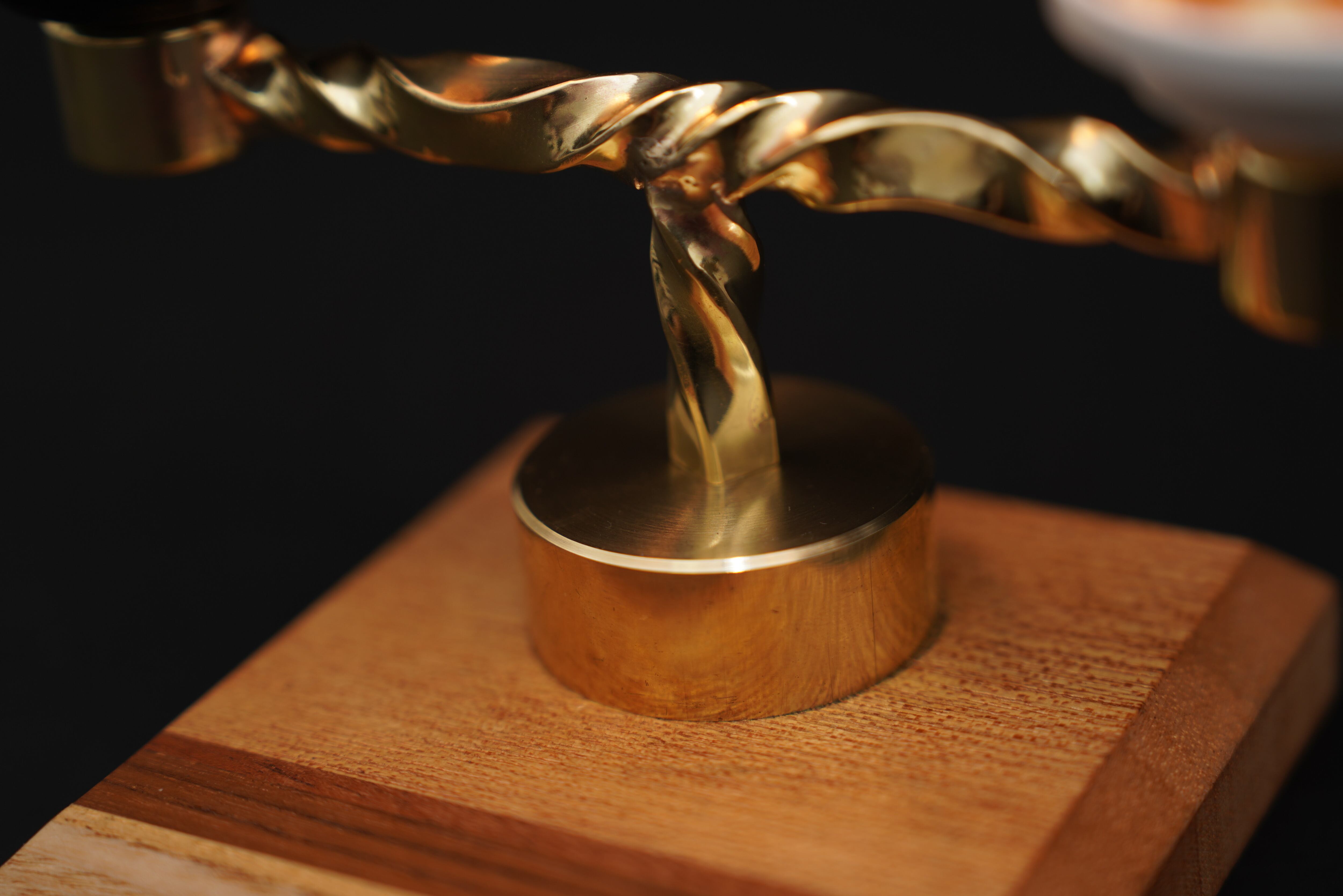 無垢の寄木土台と、手作業で成形した真鍮アームを組み合わせたスタンド。