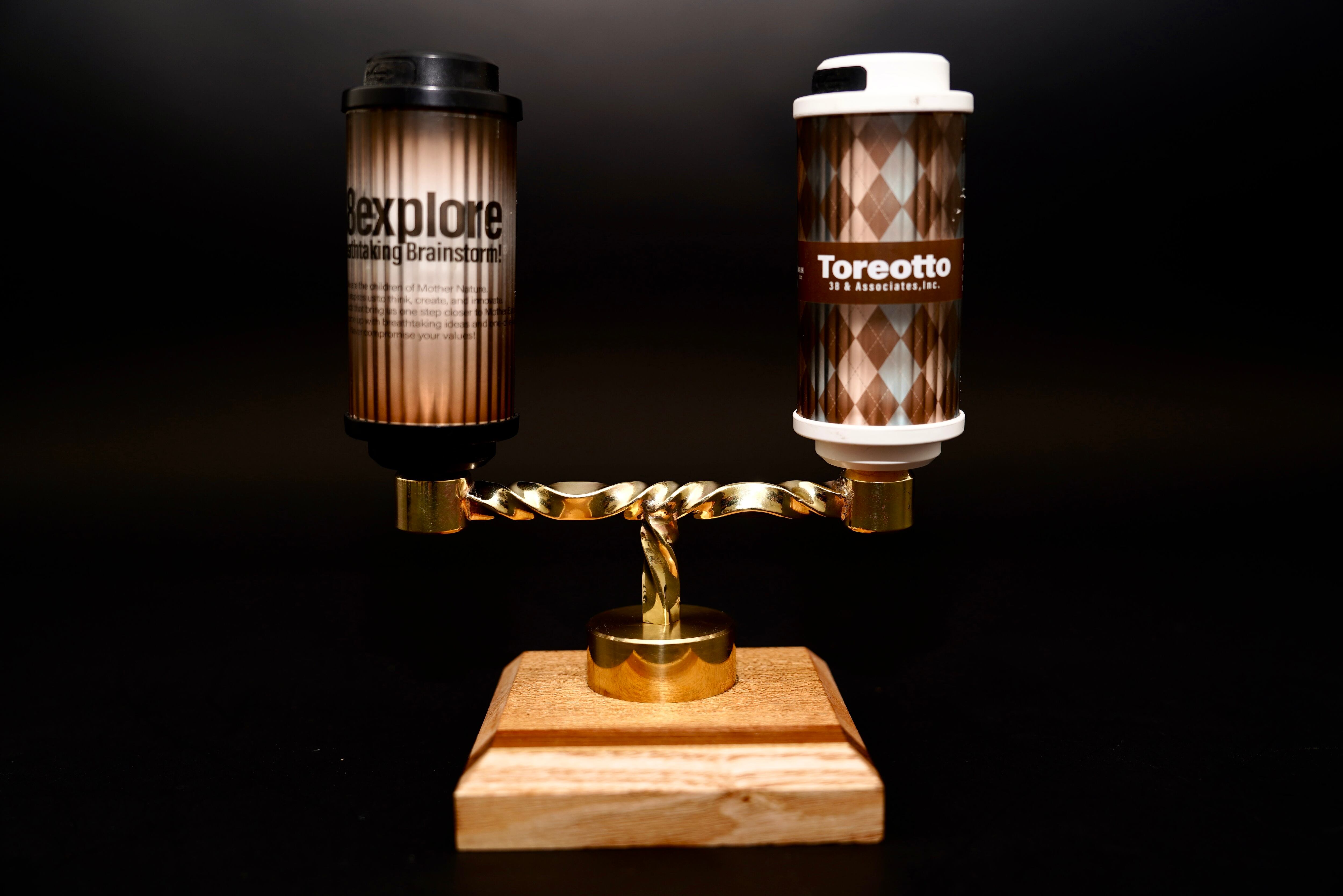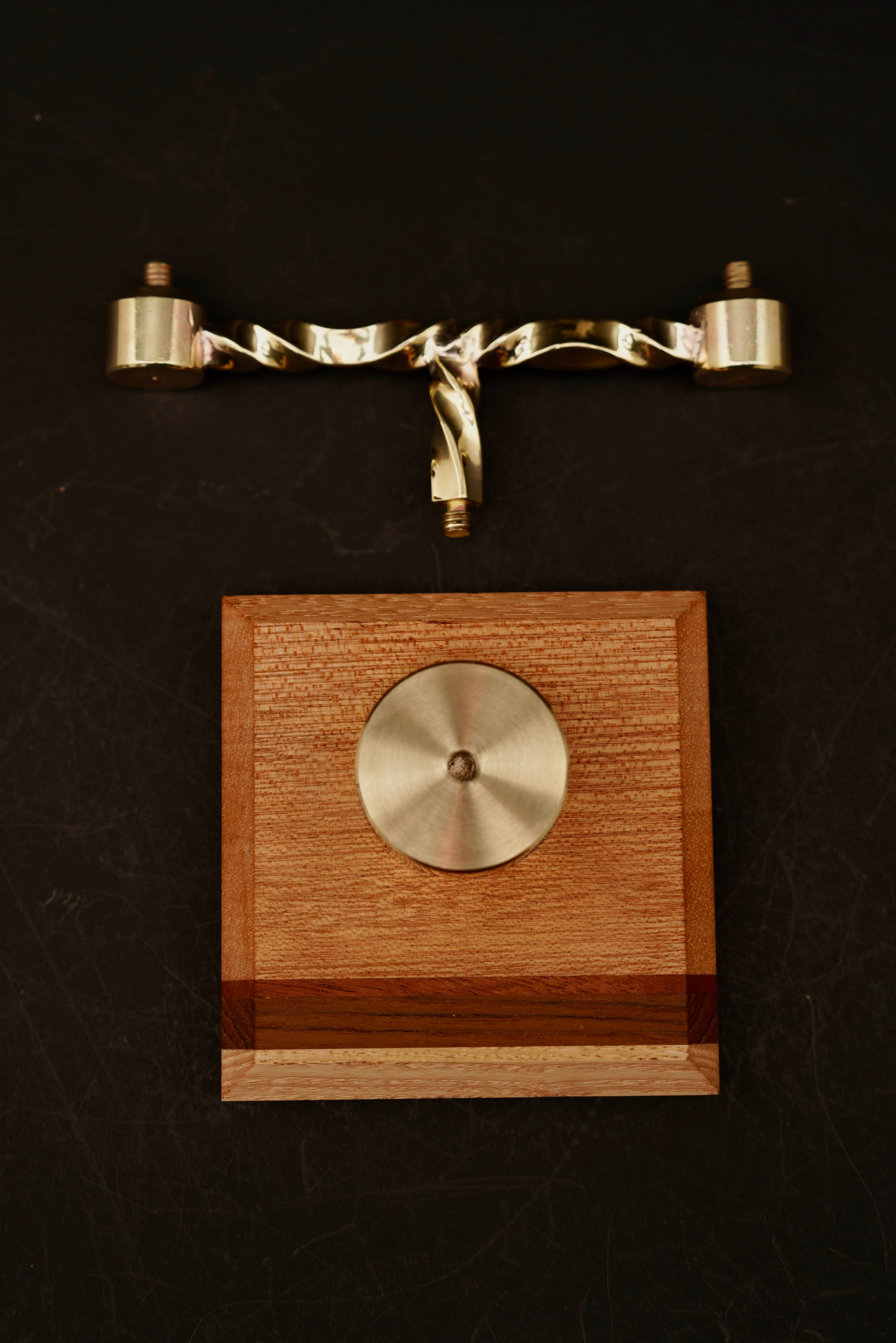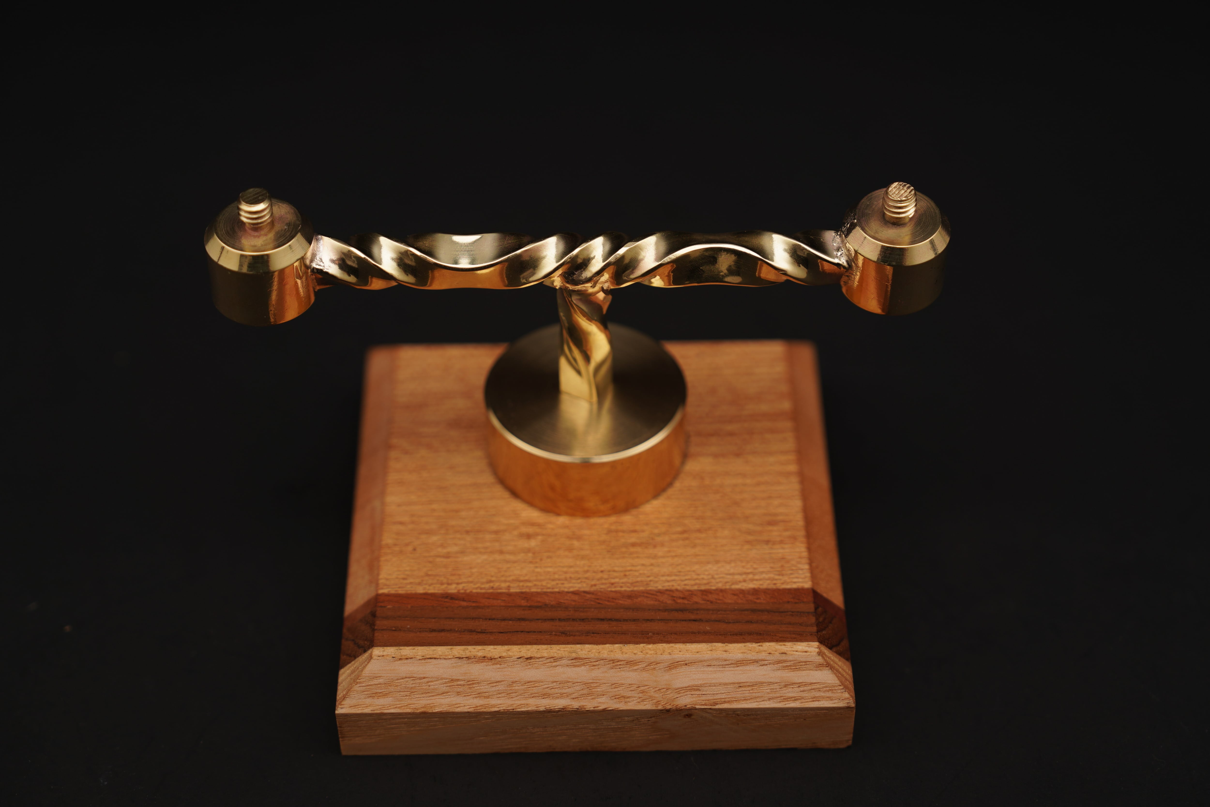 無垢の寄木土台と、手作業で成形した真鍮アームを組み合わせたスタンド。