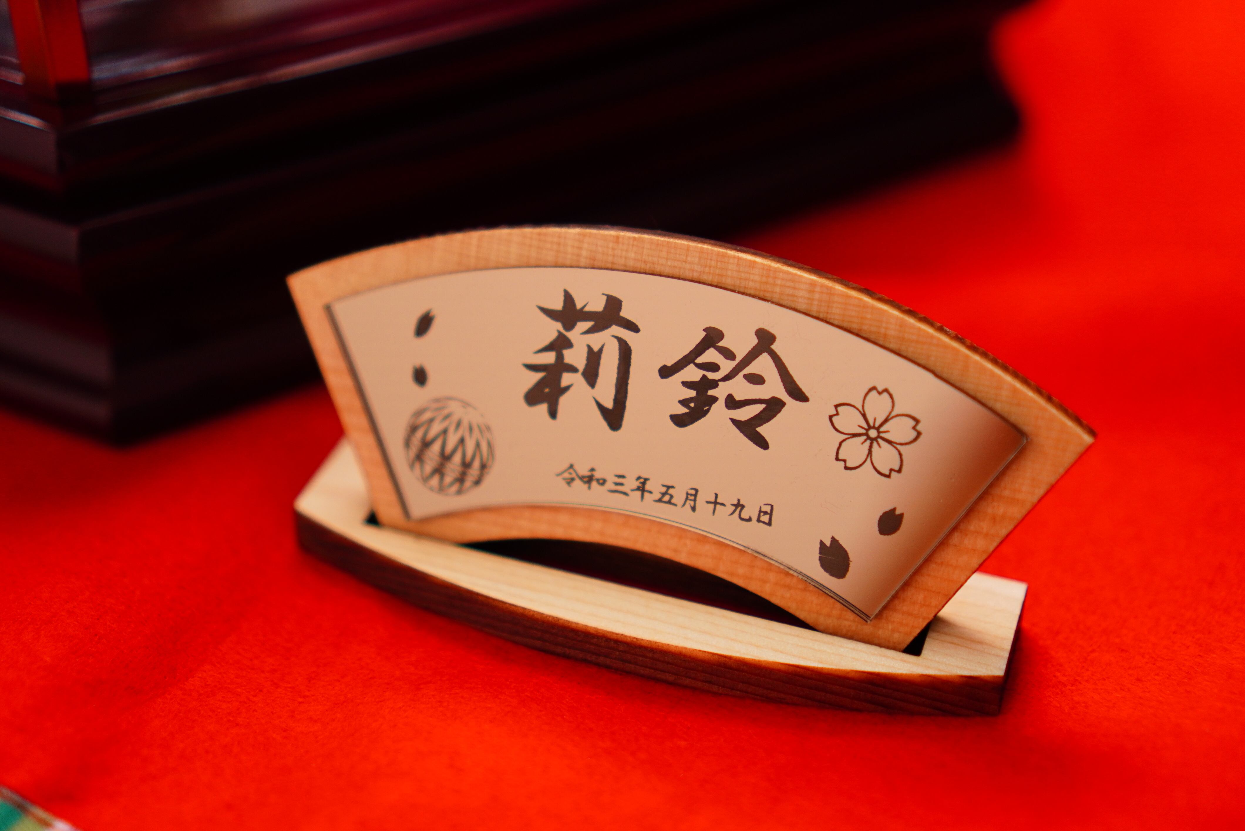 名前札として飾れる木の名前札、ひなまつりの記念撮影にぴったりです。