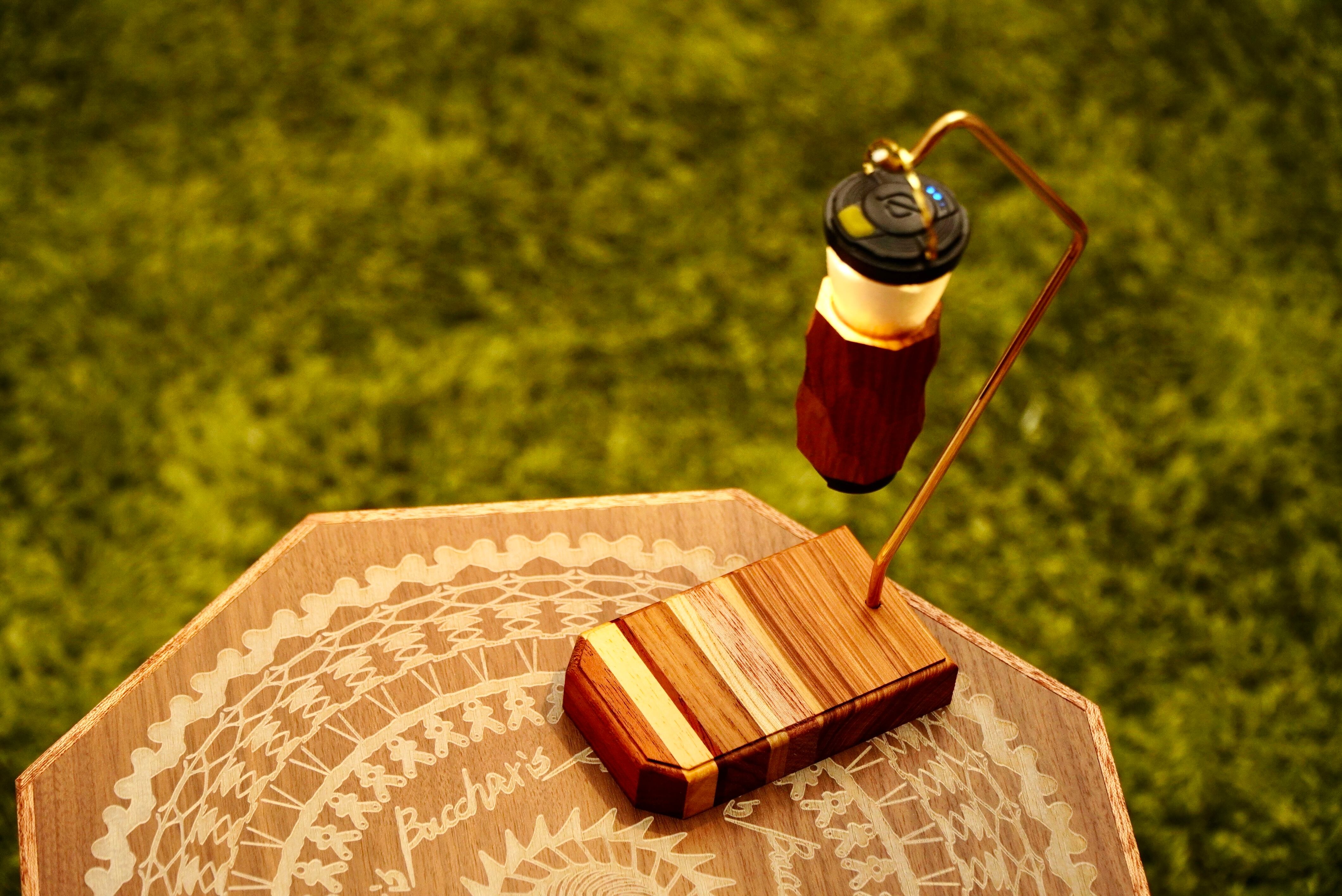 寄せ木と真鍮の相性がとってもよく、キャンプ時以外、お家のインテリアとしてもお使いいただけると思います。